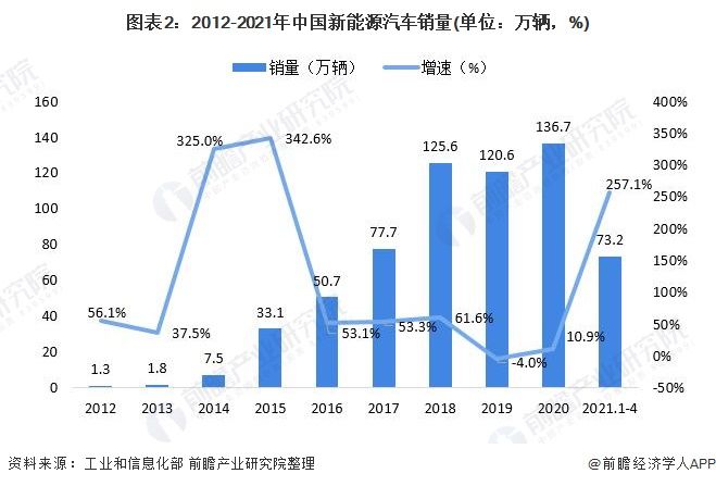 从需求端来看,2012-2020年我国新能源汽车销量整体呈增长趋势。2020年,在新冠疫情的影响下,新能源汽车销量仍然实现了10.9%的增长。2021年以来,新能源汽车销量增速较快,2021年1-4月,我国新能源汽车销量达73.2万辆,同比增长257.1%。